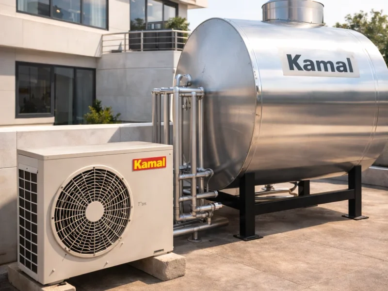 Kamal Solar Heat Pump with integrated pressurized storage tank. Features powerful heat pump technology paired with a pressurized tank for strong hot water delivery at all taps. Perfect for multi-storey buildings and modern plumbing systems. Saves up to 75% on water heating electricity bills while providing consistent hot water on demand.